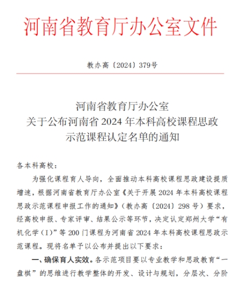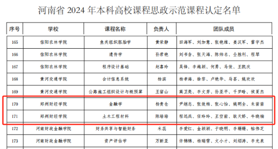 近日,河南省教育厅发布《关于公布河南省2024 年本科高校课程思政示范课程认定名单的通知》(教办高〔2024〕379号),万象城杨贵仓老师主持的《金融学》和陈培培老师主持的《土木工程材料》两门课程被认定为河南省2024年本科高校课程思政示范课程。