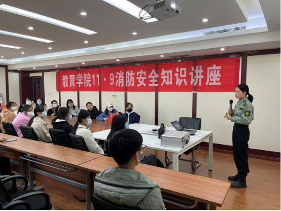 为提高广大师生的安全防范意识,普及消防安全知识,11月26日下午,教育学院邀请河南护民消防宣教中心教官刘玲在德正楼608会议室作以“珍爱生命 远离火灾”为题的消防安全知识讲座,并在学生宿舍淑苑楼下举行消防演练活动,21级小学教育5班辅导员及学生参加活动。