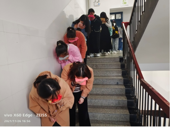 灭火演练后,同学们在宿舍楼开展火灾紧急疏散演练。刘玲教官讲授了火场逃生的技巧,随着警报声响起,同学们拿出事先准备好的毛巾,遮住口鼻,低头弯腰,迅速有序地往楼下撤离。