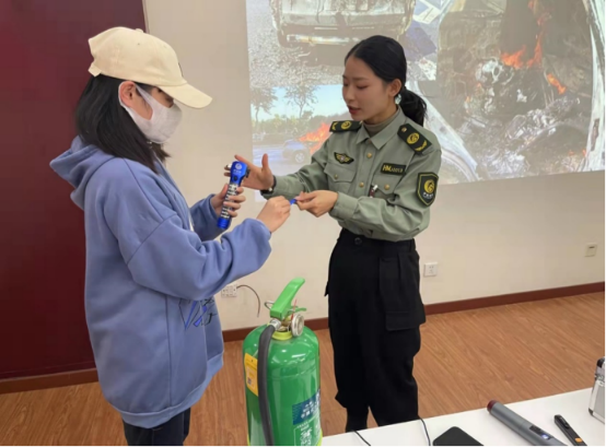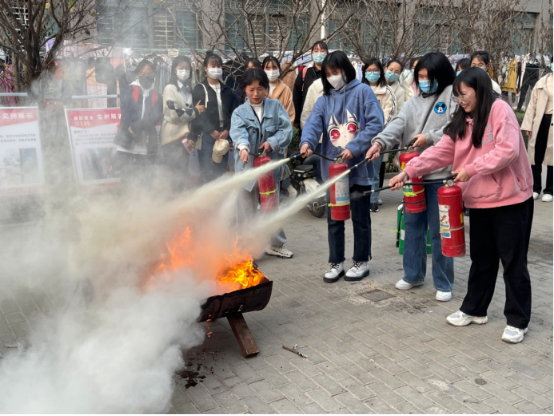 讲座结束后,刘玲带领学生来到淑苑宿舍楼下进行灭火演练,并讲述灭火器的正确使用方法及灭火要点,强调相关注意事项。随后,同学们拿起事先准备好的灭火器,进行了灭火演练。