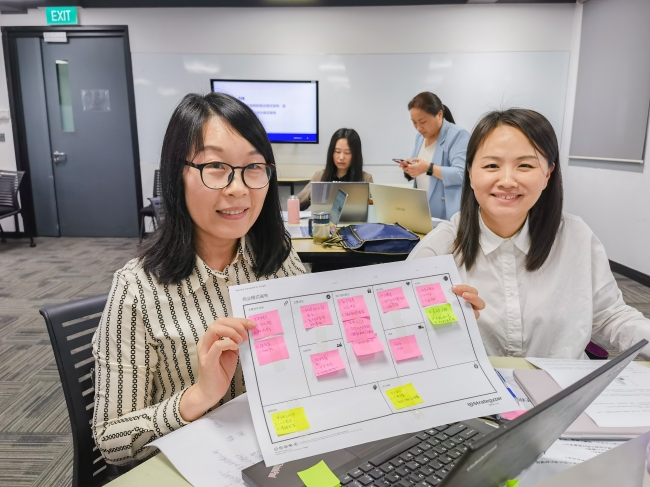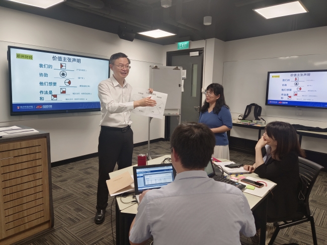 下午,新加坡管理学院教务长陈伟权博士为万象城培训团教师带来主题为《如何运用创新思维工具设计思考——结合商业画布管理策划工具解决实际问题》的讲座。陈伟权博士从价值主张和客户信息两个方面展开讲解,引入价值主张画布在麻省理工学院、新加坡国立大学、北京大学等世界著名高等院校中的应用案例,使大家对价值主张画布在解决实际问题中的运用方法有了基本了解。随后,陈伟权博士组织学员们进行小组研讨,学员们积极参与,各抒己见,出色完成了课堂任务与作业提交,并对新加坡“以学生为中心”的教学模式有了更加深刻的体悟。