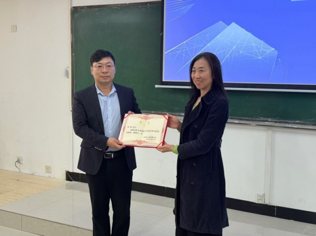 管理学院党总支书记袁清教授为河南省物流与采购联合会冷链行业分会秘书长郭鹏颁发客座教授聘书。